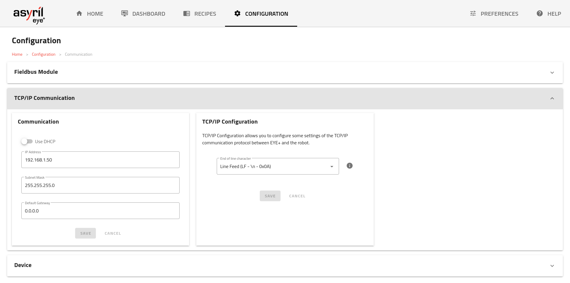 Von hier aus können Sie die Konfigurationseinstellungen der Kommunikationsschnittstellen Feldbus (falls einer angeschlossen ist), TCP/IP-Kommunikation und Geräte ändern. Stellen Sie sicher, dass Ihre Konfigurationseinstellungen mit der Konfiguration der an EYE+ angeschlossenen Geräte kompatibel sind. Sie müssen sich im selben Netzwerk befinden.