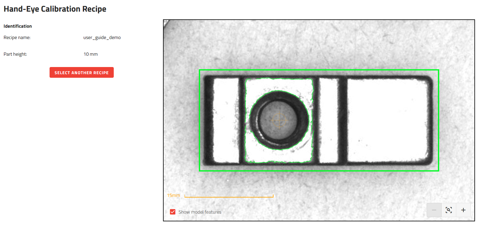 Wenn Sie das Rezept für die Hand-Augen-Kalibrierung ändern müssen, müssen Sie dieses Rezept in ändern und dann die Hand-Augen-Kalibrierung erneut starten, wobei Sie das geänderte Rezept auswählen.