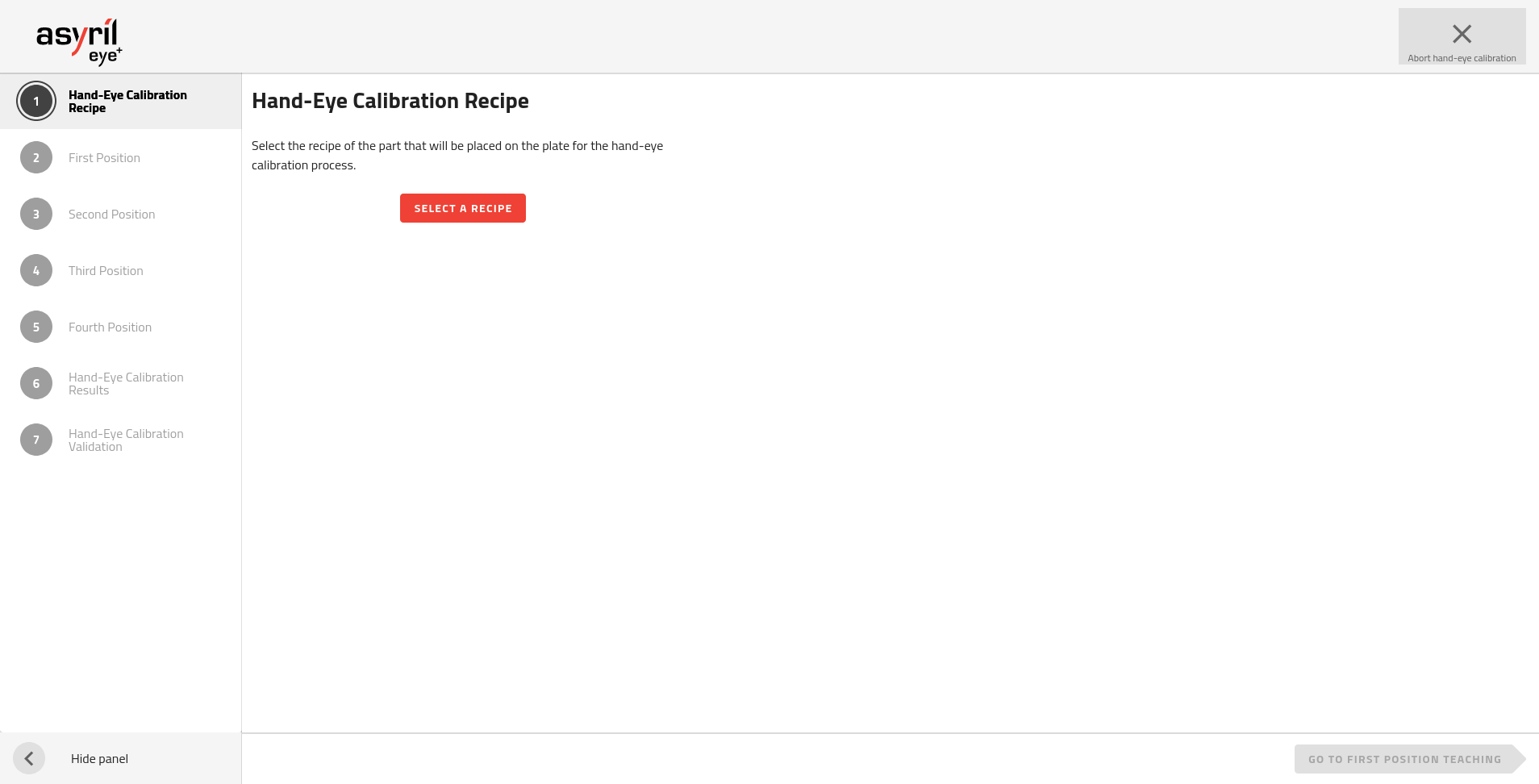 Sie müssen ein Rezept auswählen, das dann für die Hand-Augen-Kalibrierung verwendet wird. Die erforderlichen Rezeptparameter werden in das Rezept für die Hand-Augen-Kalibrierung kopiert. Es besteht keine dynamische Verknüpfung zwischen dem ausgewählten Rezept und dem Rezept für die Hand-Augen-Kalibrierung.