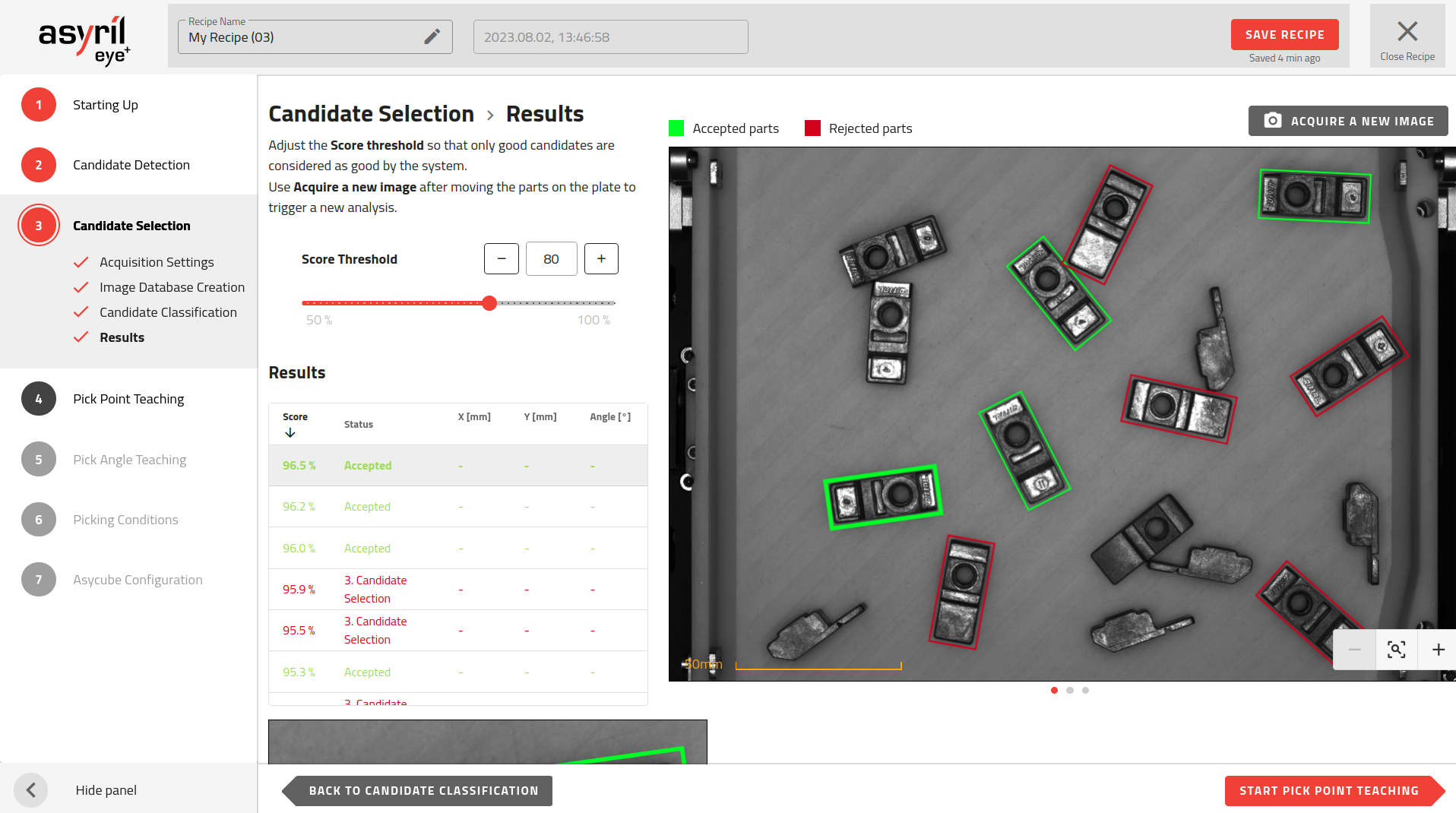 Auf dieser Seite wird das Ergebnis Ihrer Klassifizierung dargestellt. Eine gute Klassifizierung zeichnet sich durch einen grossen Unterschied im Prozentwert zwischen den abgelehnten und den akzeptierten Teilen aus (z. B. ein Ergebnis von 88.4% für gute Kandidaten und von 12.2% für schlechte Kandidaten). Der Prozentwert stellt die Wahrscheinlichkeit dar, dass ein erkanntes Teil zum Label eines guten Kandidaten gehört.