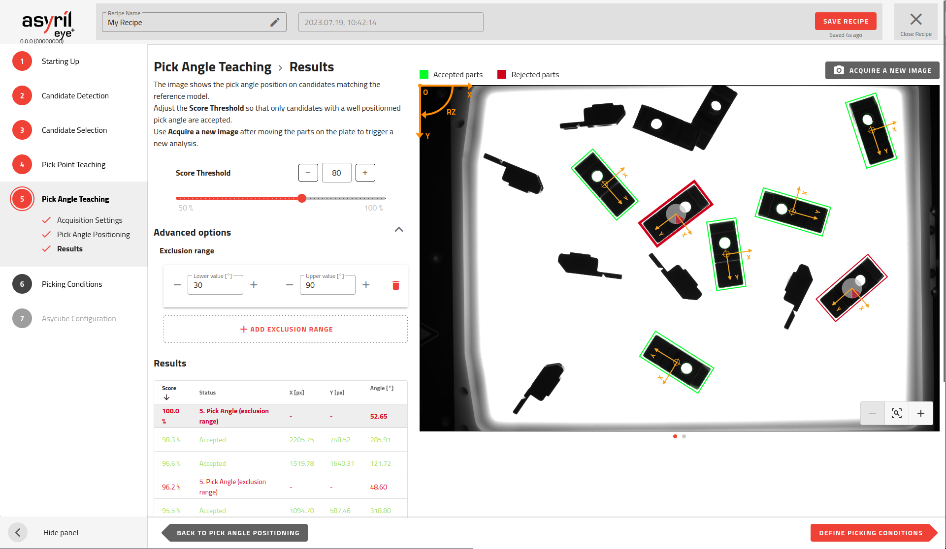 Sie können die Teile manuell auf der Platte bewegen und dann auf die Schaltfläche „Ein neues Bild aufnehmen“ klicken, um zu prüfen, ob der Entnahmewinkel immer richtig erkannt wird.