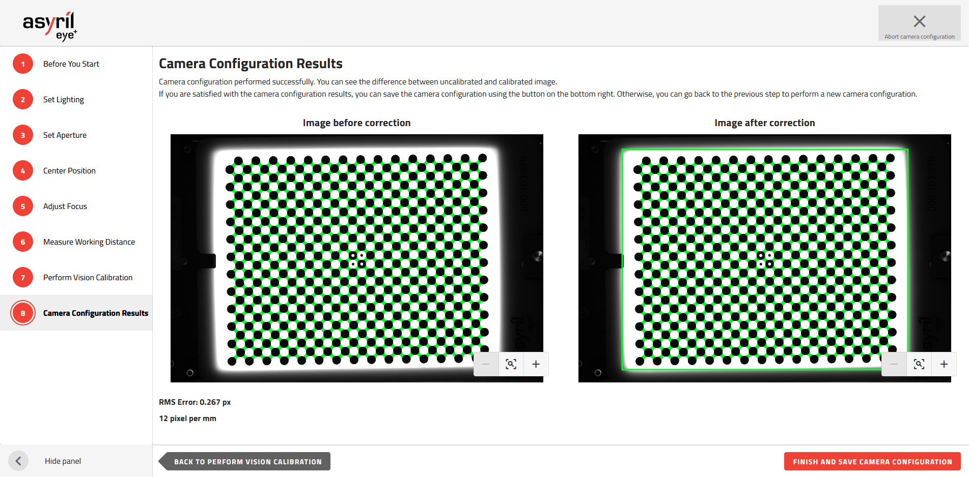 sicherzustellen, dass die Kamera in Bezug auf die Asycube Vision-Kalibrierplatte zentriert ist.