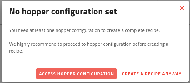 Bevor Sie ein Rezept erstellen können, müssen Sie eine Bunkerkonfiguration erstellen. Ein Dialogfenster (Abb. 13) informiert Sie, ob die Bunkerkonfiguration fehlt, bevor Sie den Rezeptassistenten öffnen.
