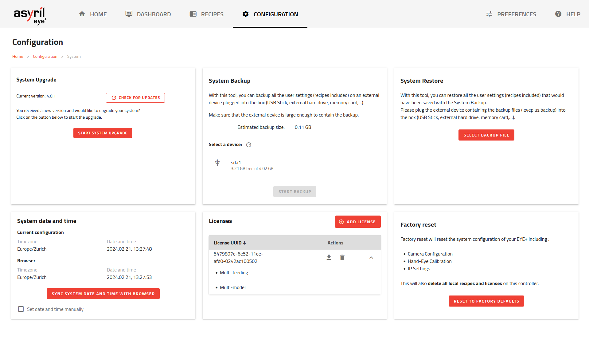 Periodic upgrades will be available. System upgrade allows you to obtain the latest EYE+ functionalities. The file format of the new version provided by Asyril is a .upgrade. The file can be downloaded from EYE+ Studio Release.