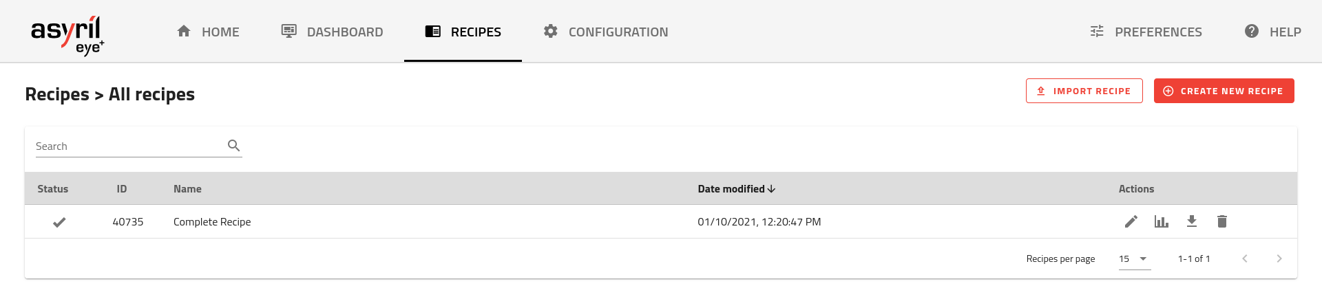 Follow the wizard step by step. Once it is done, you should see your first recipe in the list of recipe from page (Fig. 14). Keep in mind the identifier of your recipe for the last step of the quick start.