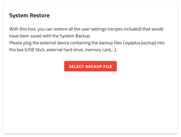 Après éa restauration, il ne sera plus possible de récupérer les recettes et les configurations qui étaient enregistrées sur votre EYE+. Elles seront complètement effacées par la restauration.