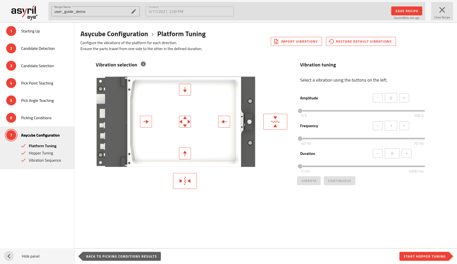 Une fois que vous avez trouvé l’amplitude et la fréquence optimales pour garantir un bon comportement des pièces, fixez la durée nécessaire à vos pièces pour passer d’un côté à l’autre de l’Asycube.