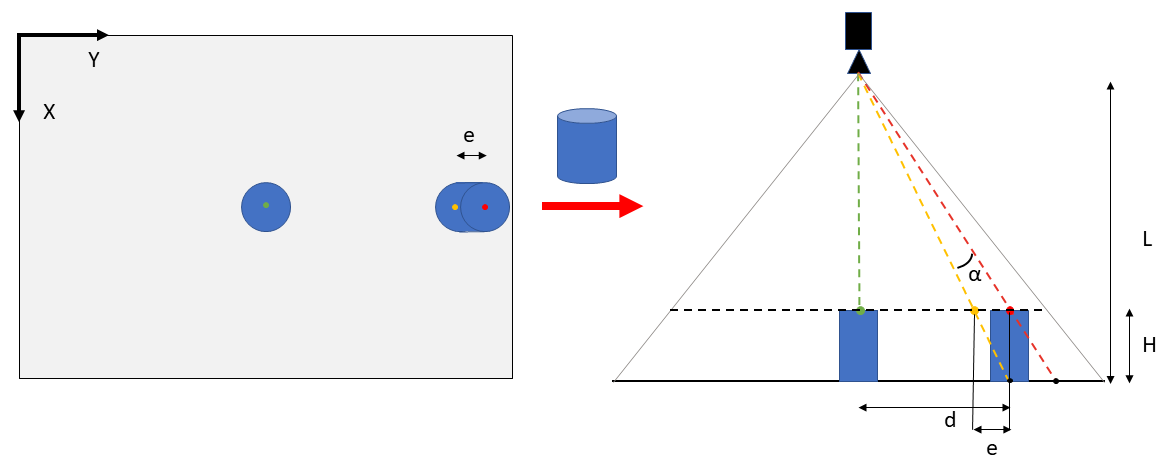 Dans la situation présentée à la Fig. 318, l’erreur de projection en perspective produit un déplacement vers la droite de la surface supérieure du cylindre par rapport à la base du cylindre (cylindre droit) du point de vue de la caméra. La variation en Y correspond à la distance e entre le point jaune (position réelle) et le point rouge (position détectée par EYE+ : cette position est décalée en raison de la perspective). Le point jaune correspond à la position corrigée du centre du cylindre projeté sur le plan de la caméra (ligne noire horizontale en pointillés).