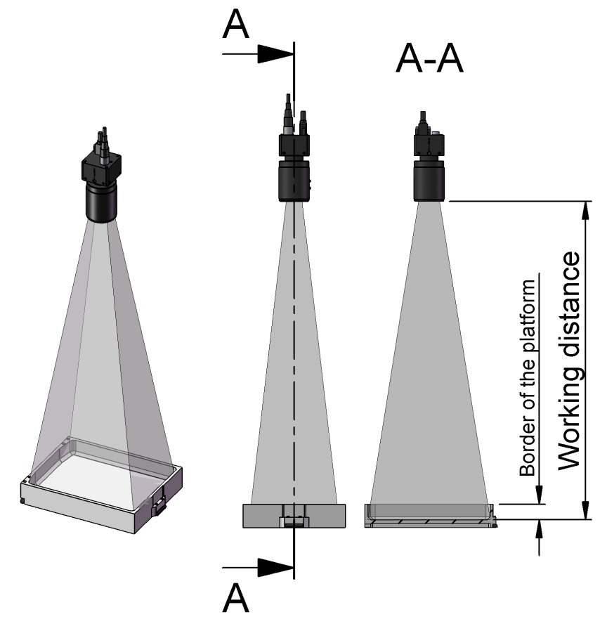 動作距離は、レンズの前面とアジキューブのプレートの間の距離です。ロボットが使用可能な高さは、動作距離からプレートの縁までの高さを引いた値になります。