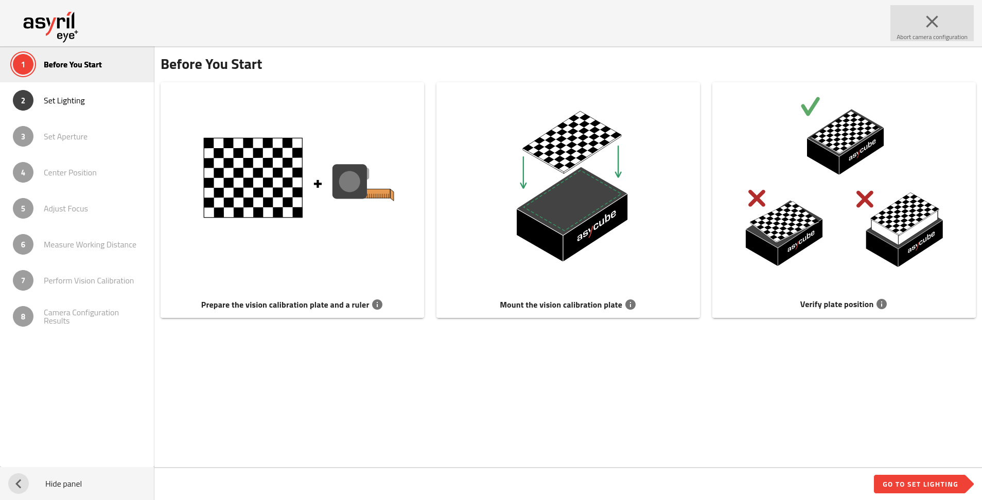 レンズの表面とアジキューブのプレートの間の距離が、 EYE+ キットの動作距離に相当すること( 表 7 を参照)。