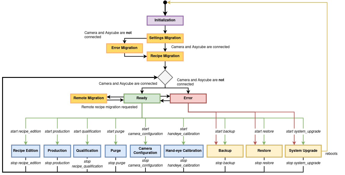 この状態は、まだ 準備完了 ではないときの EYE+ の状態です。 EYE+ は、必要なすべてのデバイス(例:カメラ、アジキューブ)に接続すると、 システム移行 状態に切り替わります。この状態で EYE+ Studio が可能な操作は、「システムの更新」または「バックアップ」のみです。