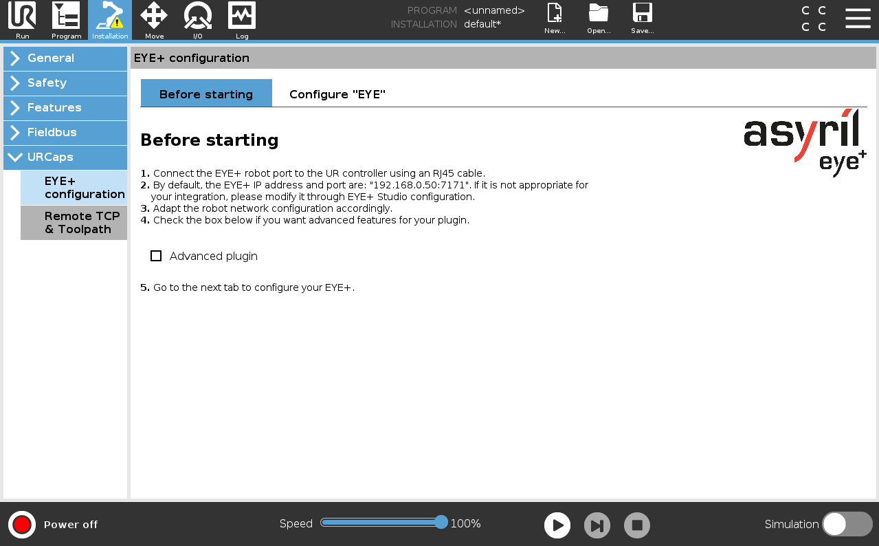 The first tab of the URCap installation gives information on how to enable the connection with your EYE+.