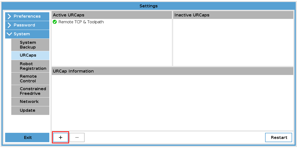 Connect the USB key to the TeachPendant of the robot. On the TeachPendant, go to the Settings/System URCaps tab and